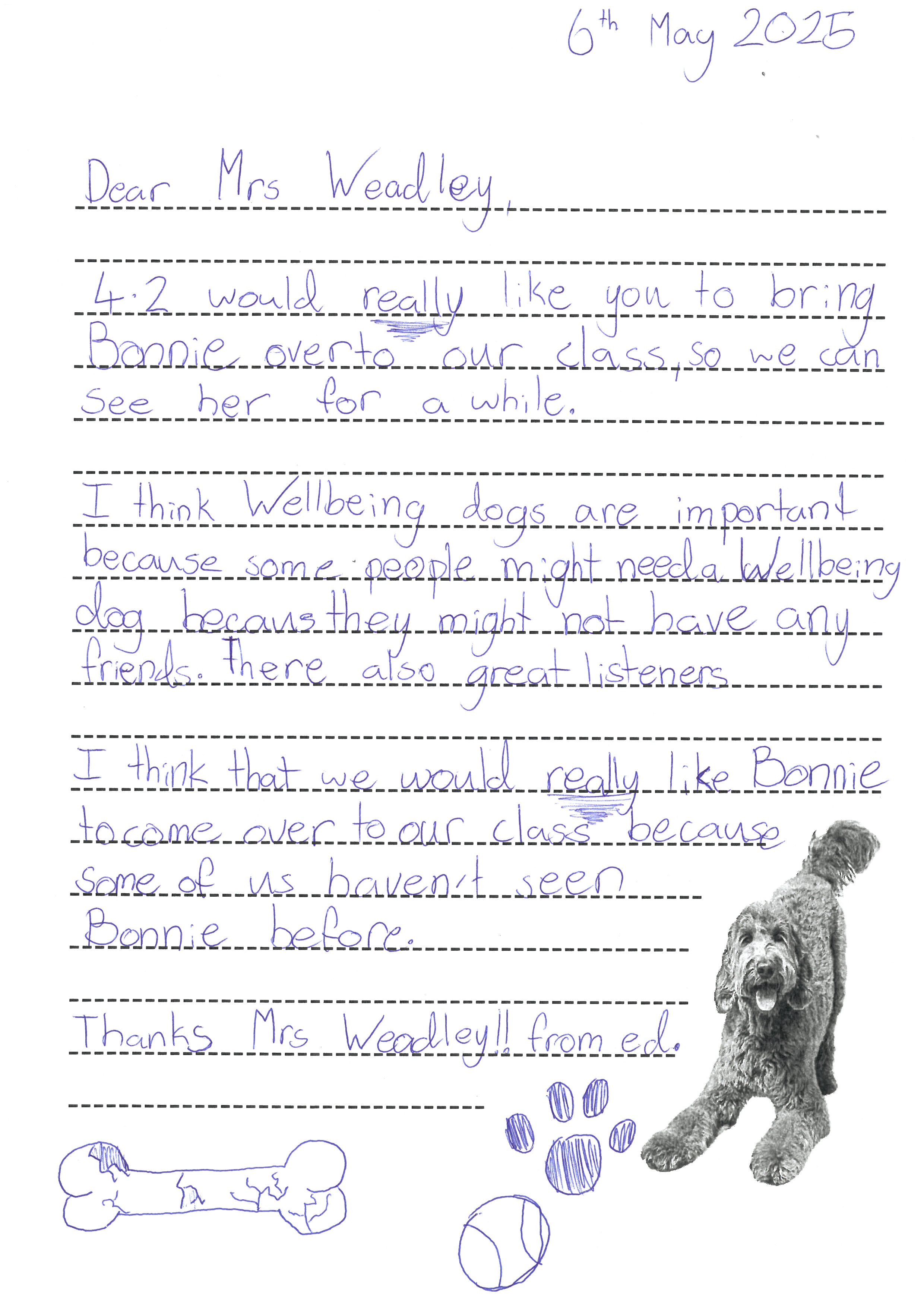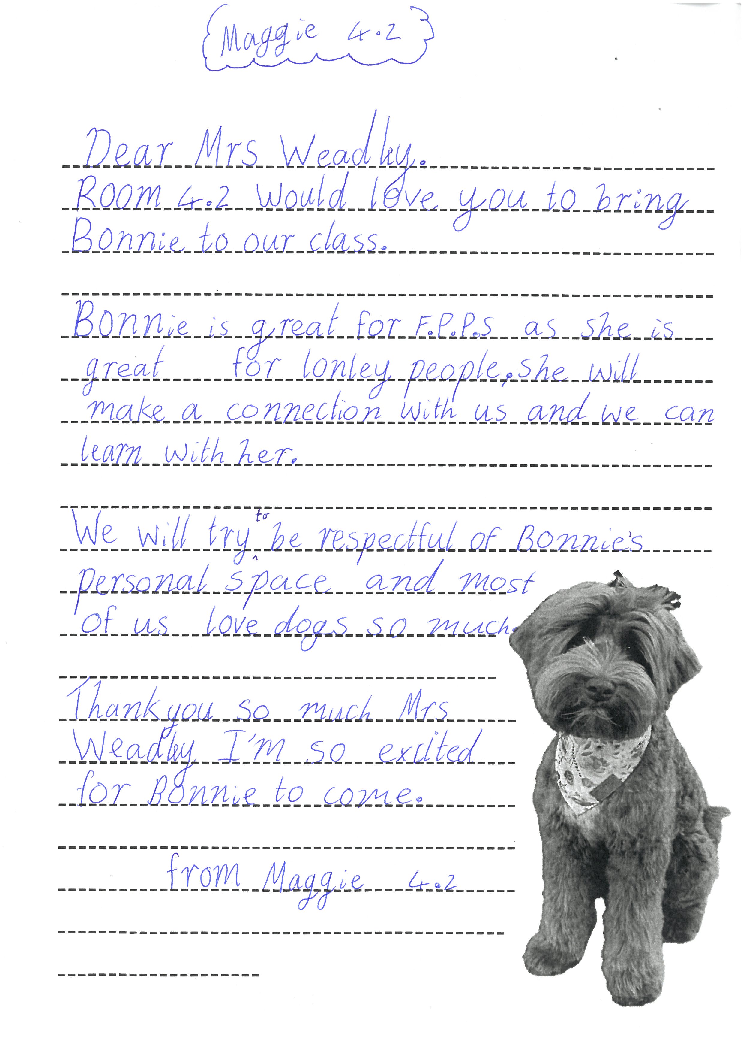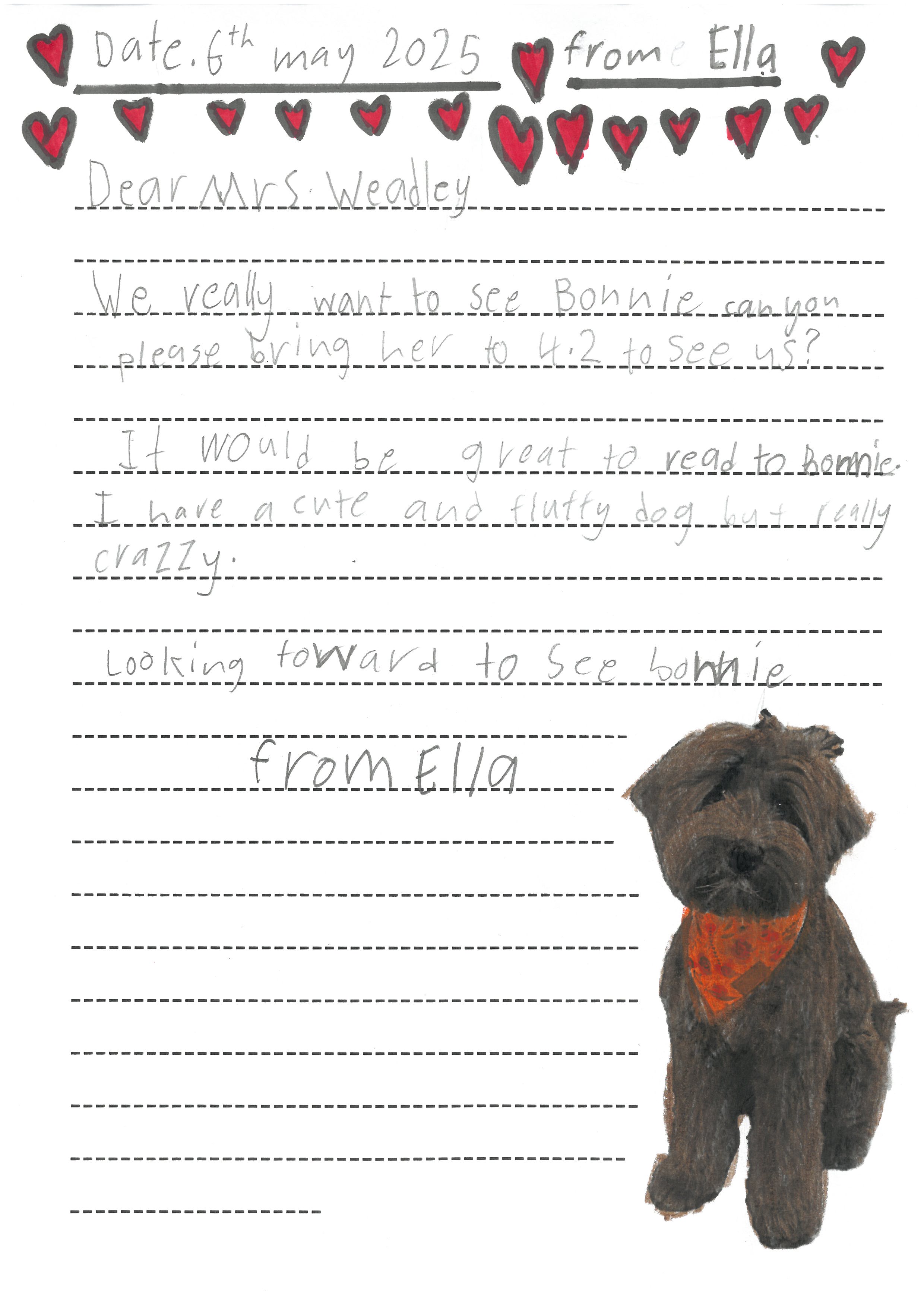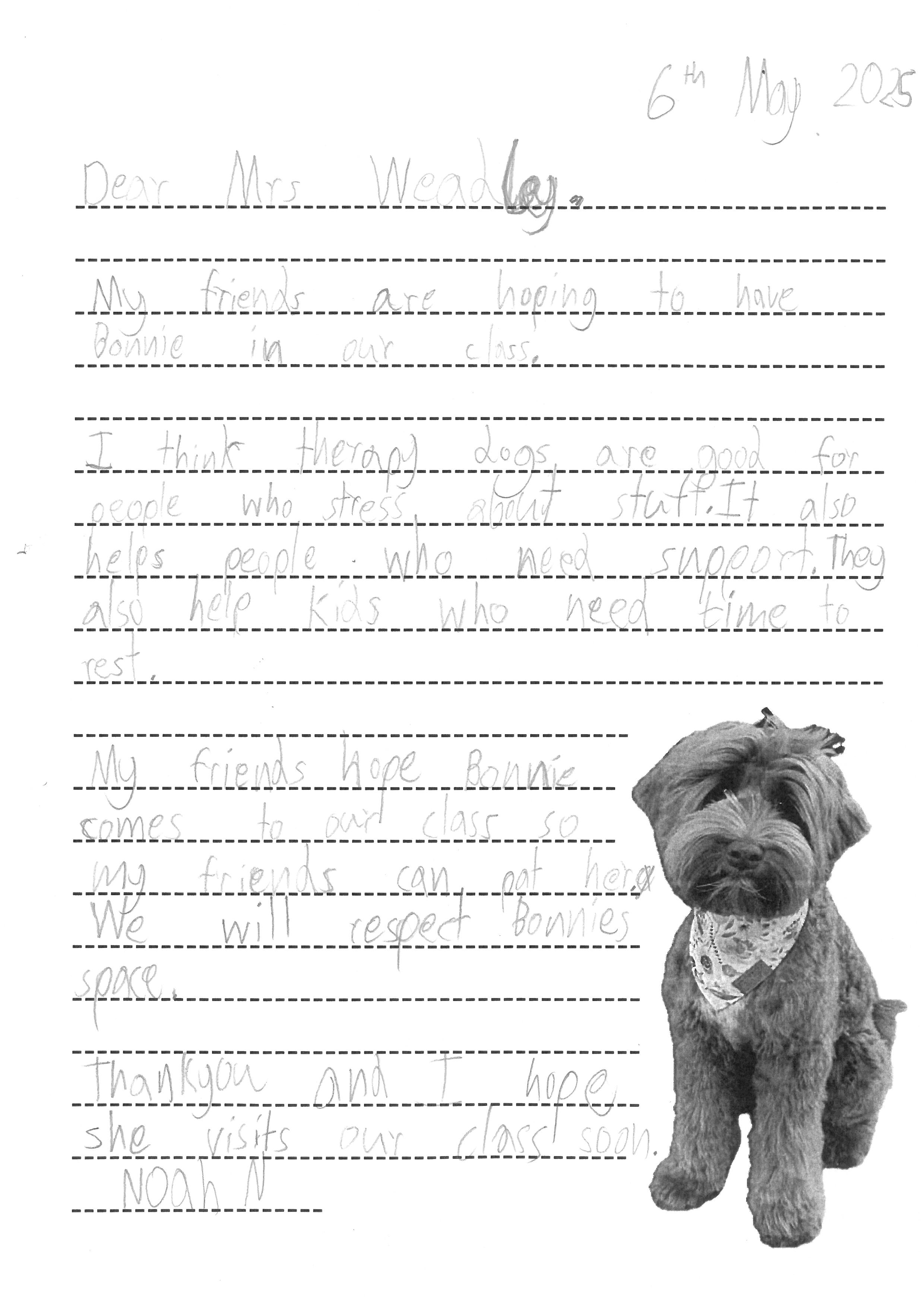 This is my first official job, and I’m currently on probation until the end of term. I’ve already loved meeting lots of students this week — thank you for the gentle pats and lovely compliments about my soft fur and stylish bandana! I live with Mrs Weadley, and together we’ve been training since I was 12 weeks old. I’m now working with Perth Animal Training Specialists to complete my Therapy Dog certification. My role is to help build a positive school culture and support everyone’s health and wellbeing. Whether it’s helping students settle into school, giving a calming cuddle, or just sharing a waggy tail and a smile — I’m here to help.